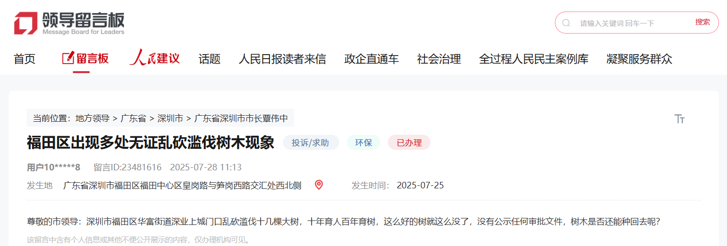 “深業上城門口亂砍濫伐十幾棵大樹,這麼好的樹就這麼沒了,沒有公示任何審批文件,樹木是否還能種回去呢?”留言市民表示。