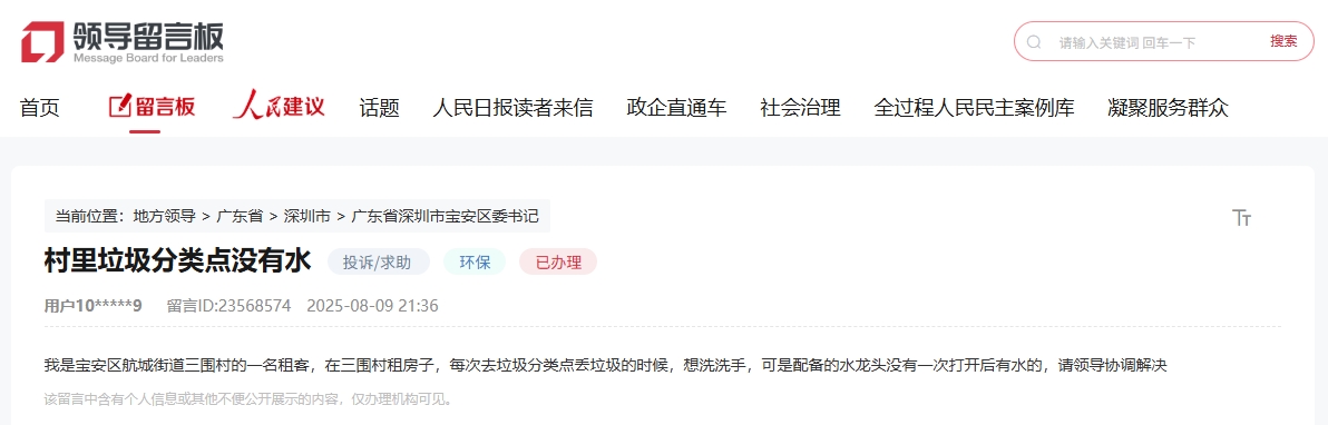 人民網深圳8月13日電 (劉森君)近日,有深圳市民在人民網“領導留言板”反映,寶安區航城街道三圍社區垃圾分類投放點洗手盆水龍頭未通水,形同虛設。