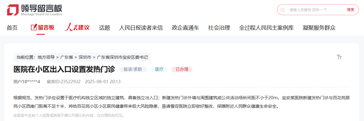 “新建發熱門診將給百花苑小區居民健康帶來極大風險隱患。”留言市民表示,懇請督促醫院立即做好整改,保障附近人民群眾健康和生命安全。