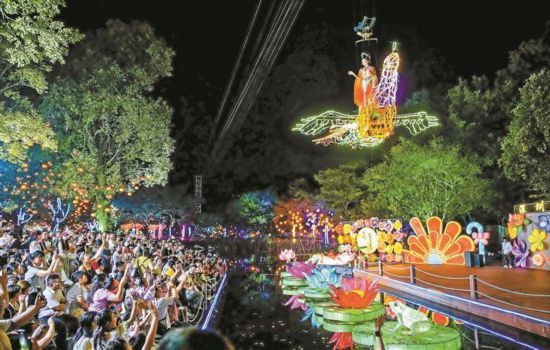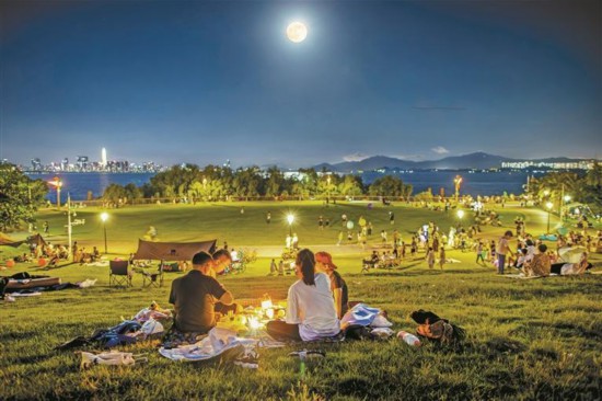 圖為深圳市民在深圳灣日出劇場(上圖)、甘坑古鎮嫦娥奔月光影秀現場(下圖)等處賞月游玩。