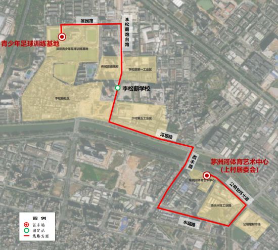 停靠站點:上村居委會(南側)-李鬆蓢學校(東側)-深圳市青少年足球訓練基地落客點