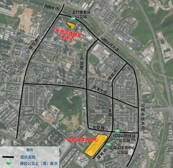 可導航定位至“紅花山體育中心”或“茅洲河體育藝術中心”接駁點,按照標識指引牌前往接駁公交上客點,換乘對應賽事接駁公交專線直達比賽場館。