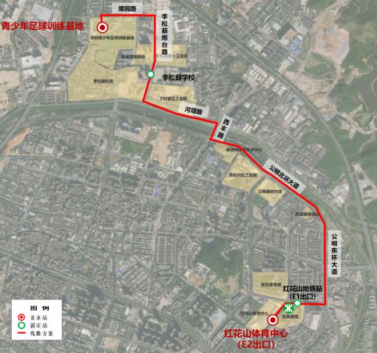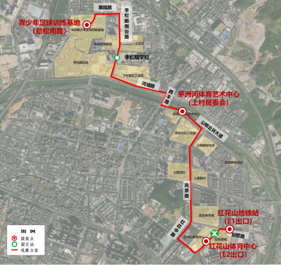 停靠站點:紅花山體育中心(東側)-紅花山地鐵站(南側)-李鬆蓢學校(東側)-深圳市青少年足球訓練基地落客點