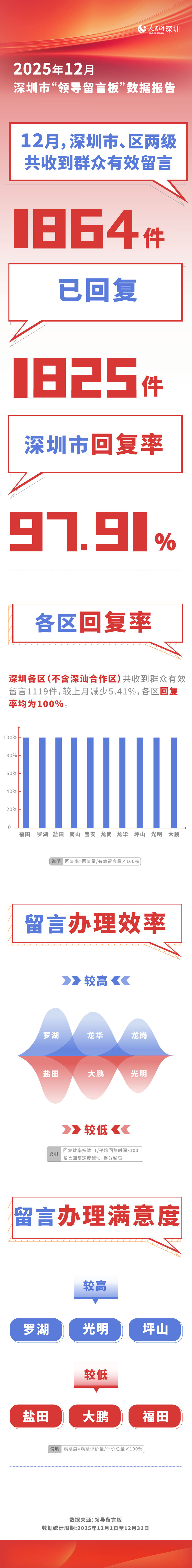 收藏人民網深圳1月15日電 (劉森君)近日,深圳市“領導留言板”2025年12月數據出爐。數據顯示,2025年12月1日—31日,深圳市、區兩級共收到群眾有效留言1864件,較上月減少3.62%﹔已回復1825件,回復率97.91%,與上月基本持平﹔整體滿意度90.98%,較上月降低1.01%。