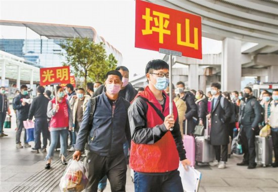 3月5日下午,523名河南籍务工人员乘坐的复工专列顺利抵达深圳北站。专列始发站为郑州,途经河南许昌、漯河、驻马店、信阳等4个站点后,直达深圳。这趟从河南开出的免费返岗专列终点站设置在深圳北站,各区再安排专车将务工人员送回厂区,实现“出门上车,下车到岗”。图为返深务工人员排队准备乘坐大巴返回厂区。深圳特区报记者 刘羽洁 摄