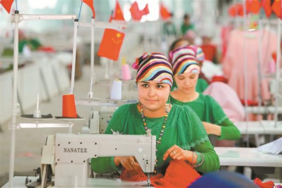 在喀什市乃则尔巴格镇,当地妇女在手工艺品专业合作社内工作,该合作社解决了近300人的就业问题。