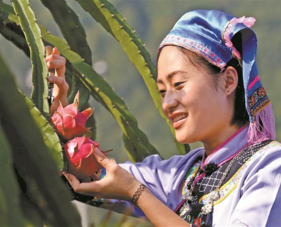 在位于贵州罗甸的阳光生态农业园内,姑娘们享受着丰收的喜悦。