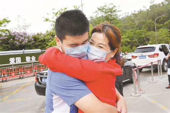 ▲送考妈妈在考点门口与儿子拥抱。 深圳商报记者 陈锡明 摄